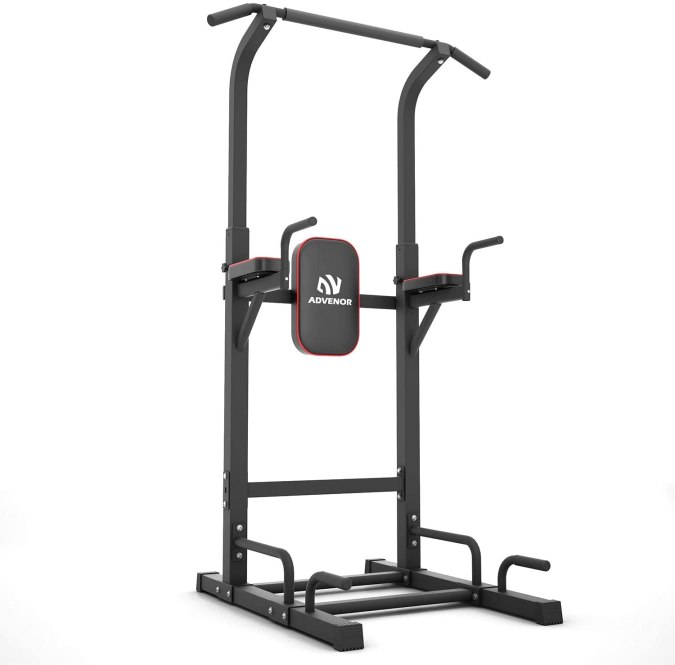 La máquina de entrenamiento Power Tower Dip Station de ADVENOR tiene 5 niveles de altura ajustables. Alcanza entre las 71.38 pulgadas y las 89.09 pulgadas. Posee cubierta con espuma para proteger tus manos de resbalones y alternar tus posturas sin preocuparte por la seguridad del agarre. Puedes encontrarla en Amazon por tan solo $139.99.
