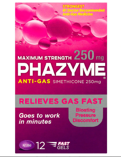 Las pastillas blandas de Phazymen contienen 250 mg de simeticona, un componente especial que se encarga de disminuir la tensión superficial de las burbujas gaseosas presentes en el estómago e intestinos. Su uso es sumamente eficaz a la hora de tratar los síntomas de flatulencias. Esta presentación de Phazyme incluye 12 cápsulas blandas y las podemos conseguir en Walgreens por un precio de $4.99.