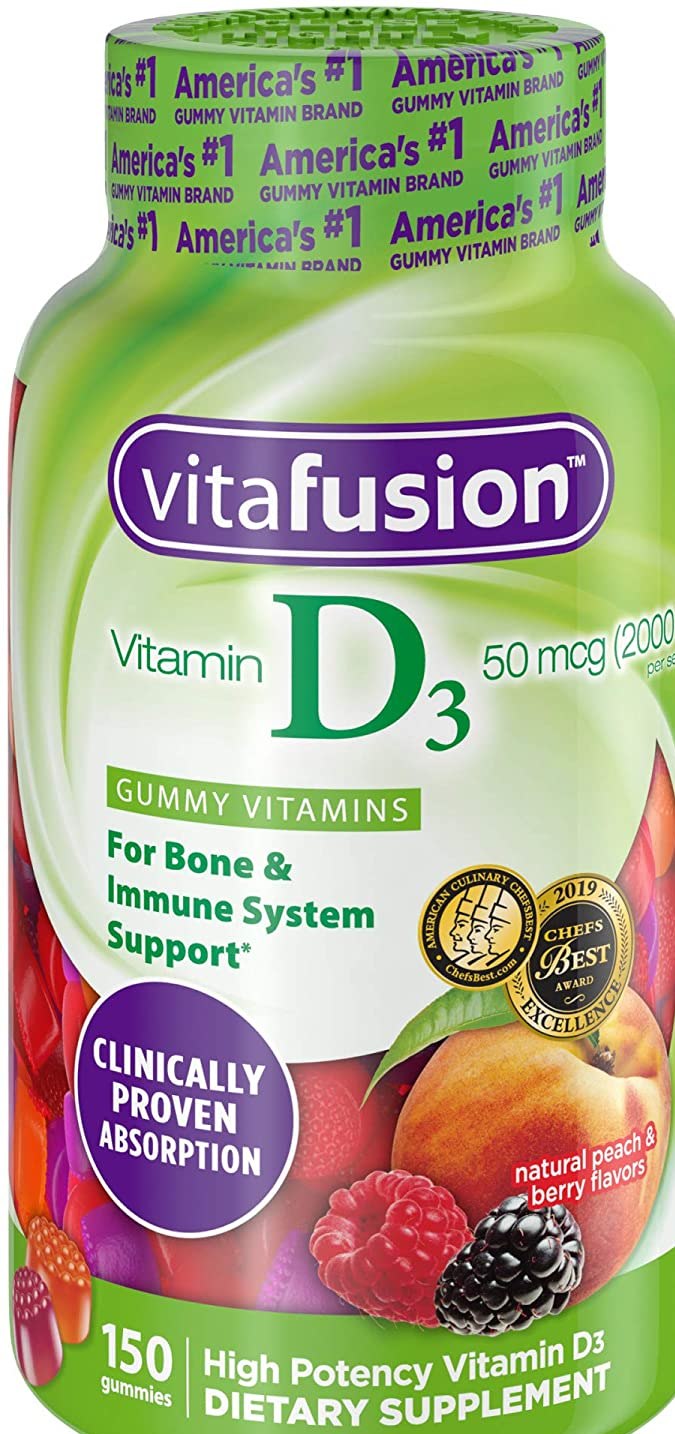 ¿Sabías? La vitamina D ayuda a la absorción de calcio, que es importante para la salud ósea. Con 2000 UI de vitamina D, también conocida como vitamina del sol, cada porción de vitamina D3 de Vitafusion apoya los huesos y los dientes, así como el sistema inmunológico. * Estas gomitas de gran sabor están hechas con sabores naturales de melocotón, mora y fresa.