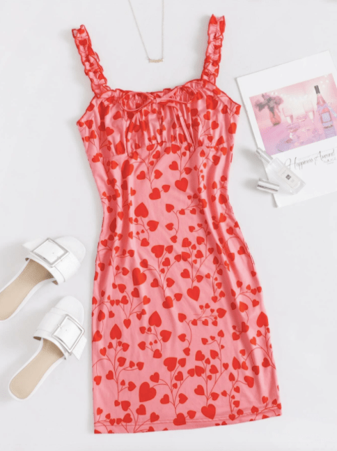 Vestido ajustado con estampado de corazón ribete fruncido de pecho fruncido $6.49