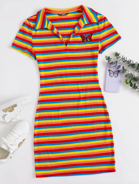 Vestido de rayas de arcoíris con bordado de mariposa de cuello V $11