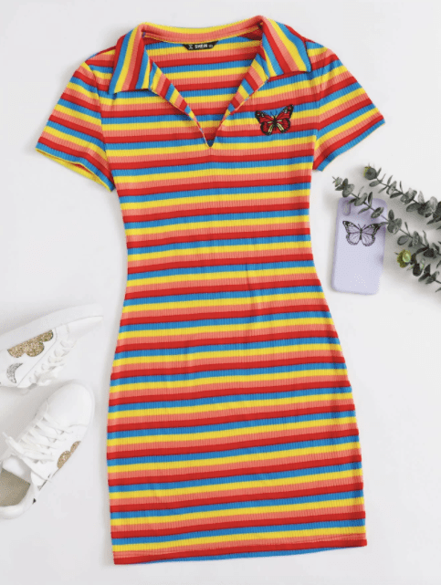 Vestido de rayas de arcoíris con bordado de mariposa de cuello V $11