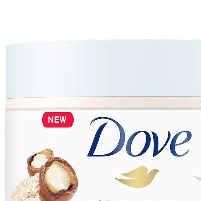 Exfoliación moderada: fabricado con partículas exfoliantes de tamaño mediano, el esmalte corporal exfoliante Dove Macadamia y la leche de arroz es suave y fácil de extender con una espuma suave