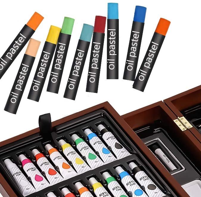 -Caja de pintura de madera de 83 piezas con 4 compartimentos: 8 pinturas acrílicas, 8 acuarelas, 8 pinturas al óleo, 3 paneles de lienzo de 5.7 x 8.3 in.