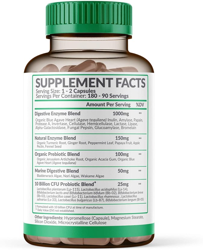 Completa mezcla de pastillas de enzimas digestivas con corazón de agave azul orgánico esencial, inulina, amilasa/amilasa, papaína, proteasa A, invertasa, celulasa, hemicelulasa, lactasa, lipasa/lipasa, alfa-galactosidasa, pepsina fúngica, glucomilasa, y bromelina y suplemento de bromelina. Además de tu suplemento probiótico y suplemento prebiótico (pre y profesional) al mismo tiempo. Todo en una práctica forma de cápsula purificada que puedes abrir y tomar como un masticable con nutrientes dietéticos, súper alimentos o comida