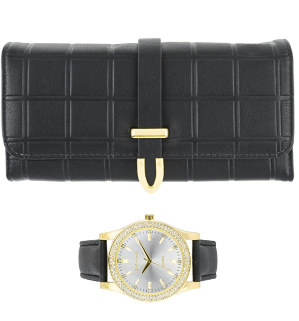 El juego de regalo para mujer incluye un reloj dorado con correa de cuero y una billetera triple a juego.