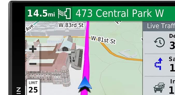 Garmin Traffic sugiere rutas alternativas. Compatible con cámara retrovisora: sí (BC 30 o BC 40)