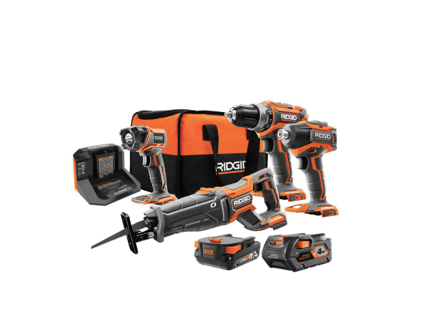 RIDGID presenta el kit combinado de 4 herramientas inalámbricas sin escobillas de iones de litio de 18 V con (1) batería de 2.0 Ah, (1) batería de 4.0, cargador y bolsa. Los motores sin escobillas RIDGID ofrecen hasta un 50% más de tiempo de ejecución y una mayor vida útil del motor.