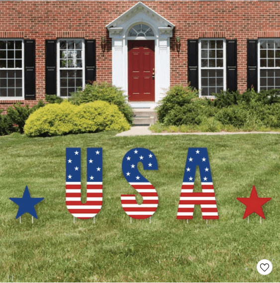 Impreso en plástico corrugado impermeable y resistente a la intemperie. Incluye 2 estacas de metal por letra y decoración de patio: «EE. UU.» Las letras grandes miden 22,5 «de alto y las estrellas miden 11 «x 10.5».