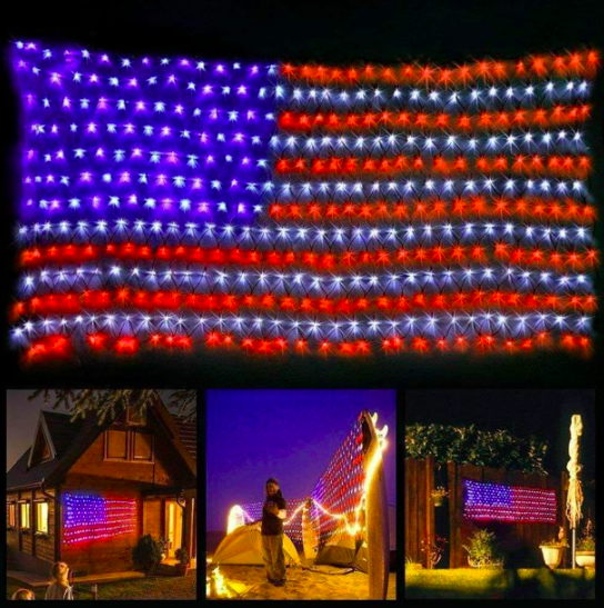 El tamaño es grande: la bandera de EE.UU es de 6.5 pies x 3.3 pies, contiene 420 luces LED de cadena. Es más grande y más segura que las demás en el mercado.