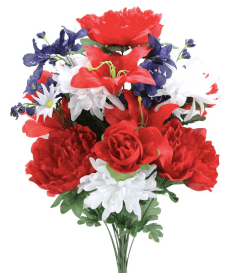 Este arbusto de flores artificiales para el Día de los Caídos es una buena decoración floral del cementerio, pues no se marchita a los pocos días. Es expandible, 24 H x 15 W x 9 D pulgadas.
