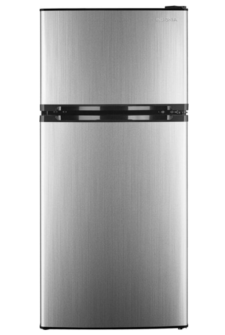 Mantén las bebidas frías en una habitación pequeña con este Insignia 4.3 Cu. Pie. Mini nevera con congelador superior. Tiene dos estantes ajustables en el frigorífico y uno en el congelador, y su cajón para verduras mantiene los productos frescos. Este Insignia 4.3 Cu. Pie. El mini refrigerador con congelador superior tiene una luz interior para detectar exactamente lo que necesita dentro.