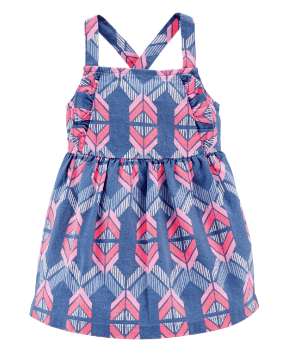 Confeccionado en una suave mezcla de lino con un estampado azteca, este vestido es perfecto para tu cutie pie.