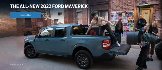 Ford está apostando por el Maverick, el cual se construirá en la sede de Hermosillo, Sonora, en México, con la intención de que tenga lo mejor de un automóvil caro, con características de último modelo, por un precio por debajo del promedio. Se construirá con la misma plataforma del anterior Ford Escape y Ford Bronco Sport. La batea contará con un tamaño de 51.18”. En cuanto al diseño, nos puede recuerda al Bronco Sport, pero en general se basa en la nueva F-150, especialmente en el tema de los faros LED. Tendrá nuevos estilos de rines y vinilos en la parte de atrás.