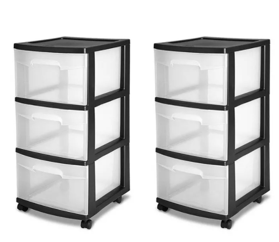 10- Carro de almacenamiento de 3 cajones Sterilite, transparente con marco negro (paquete de 2) – de $66.99 a $49.99