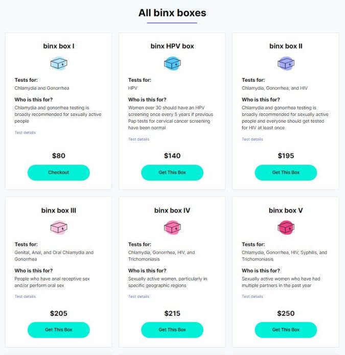 Los surtidos de pruebas de cajas binx se basan en las pautas de los CDC y en el Grupo de Trabajo de Servicios Preventivos de EE. UU. Todos los pedidos son revisados por un médico autorizado. Es un servicio que puedes encontrar en las farmacias Walgreens y te llevan a completar unos pasos directo al sitio web de binx.