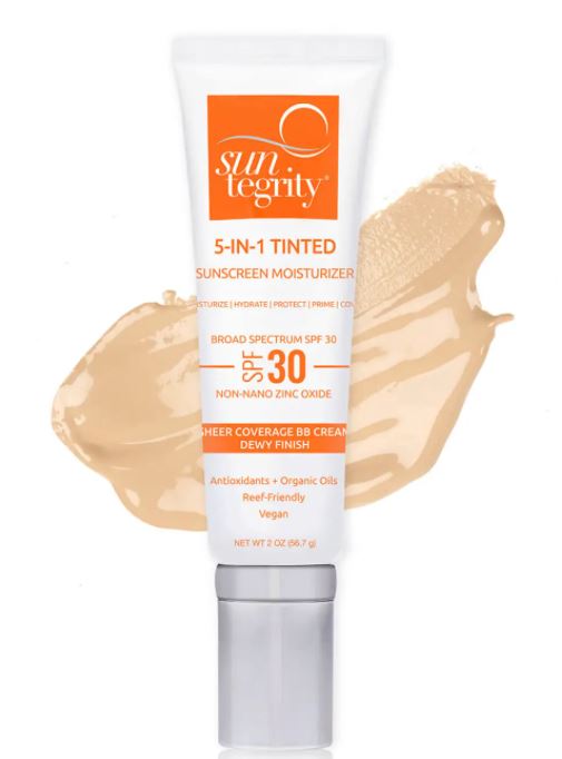 Suntegrity Skincare 5 en 1 Natural Moisturizing Face Sunscreen SPF 30 hidrata la piel con una fórmula multitarea diseñada para ocultar imperfecciones. Los extractos de té verde, algas rojas y granada que contiene ofrecen una rica protección antioxidante.