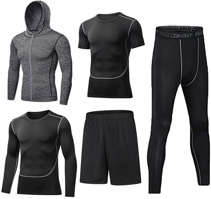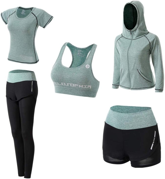 Quitan la humedad de la piel, se mantienen frescas y secas durante el ejercicio, aptas para todas las estaciones para que puedas usarla durante todo el año. En el conjunto de 5 piezas, solo los pantalones cortos están sueltos y las demás piezas son ajustadas. Con precio desde $38.90 el conjunto.