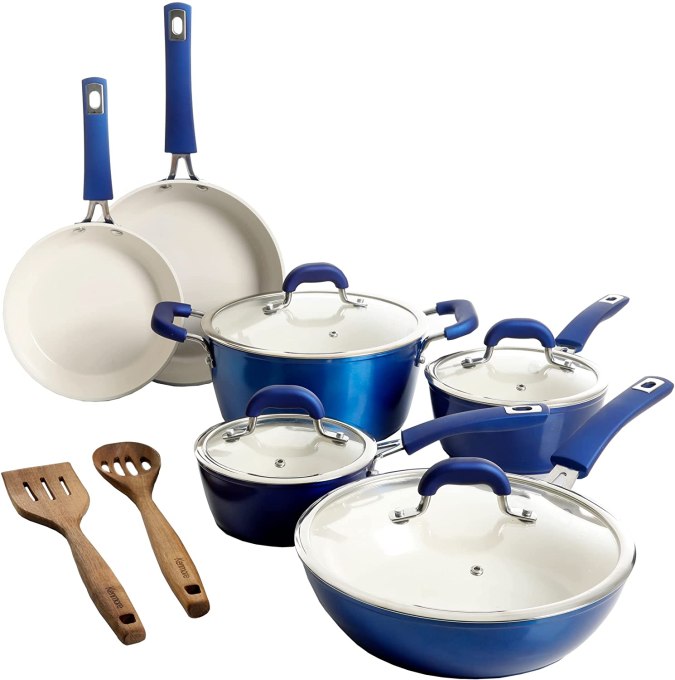 Si estás buscando un juego completo que incluya ollas, y no solo un sartén, este juego de Kenmore de 12 piezas, incluye dos sartenes: uno de 9 pulgadas y uno de 11 pulgadas. Estas cacerolas se pueden utilizar en una placa de inducción. Vienen en color metálico azul y rojo.