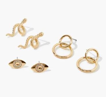 Un juego de aretes de alto brillo con serpiente, anillos entrelazados y dijes de diamantes de imitación en los ojos, todos con cierres posteriores.