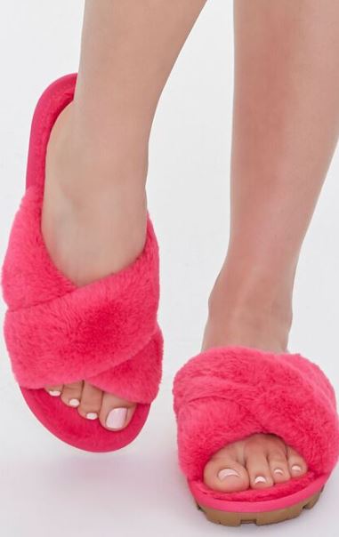 Un par de pantuflas de piel sintética afelpadas y difusas con empeine entrecruzado, puntera abierta y suela con tachuelas. Están disponibles en dos colores.